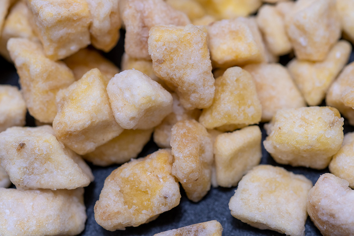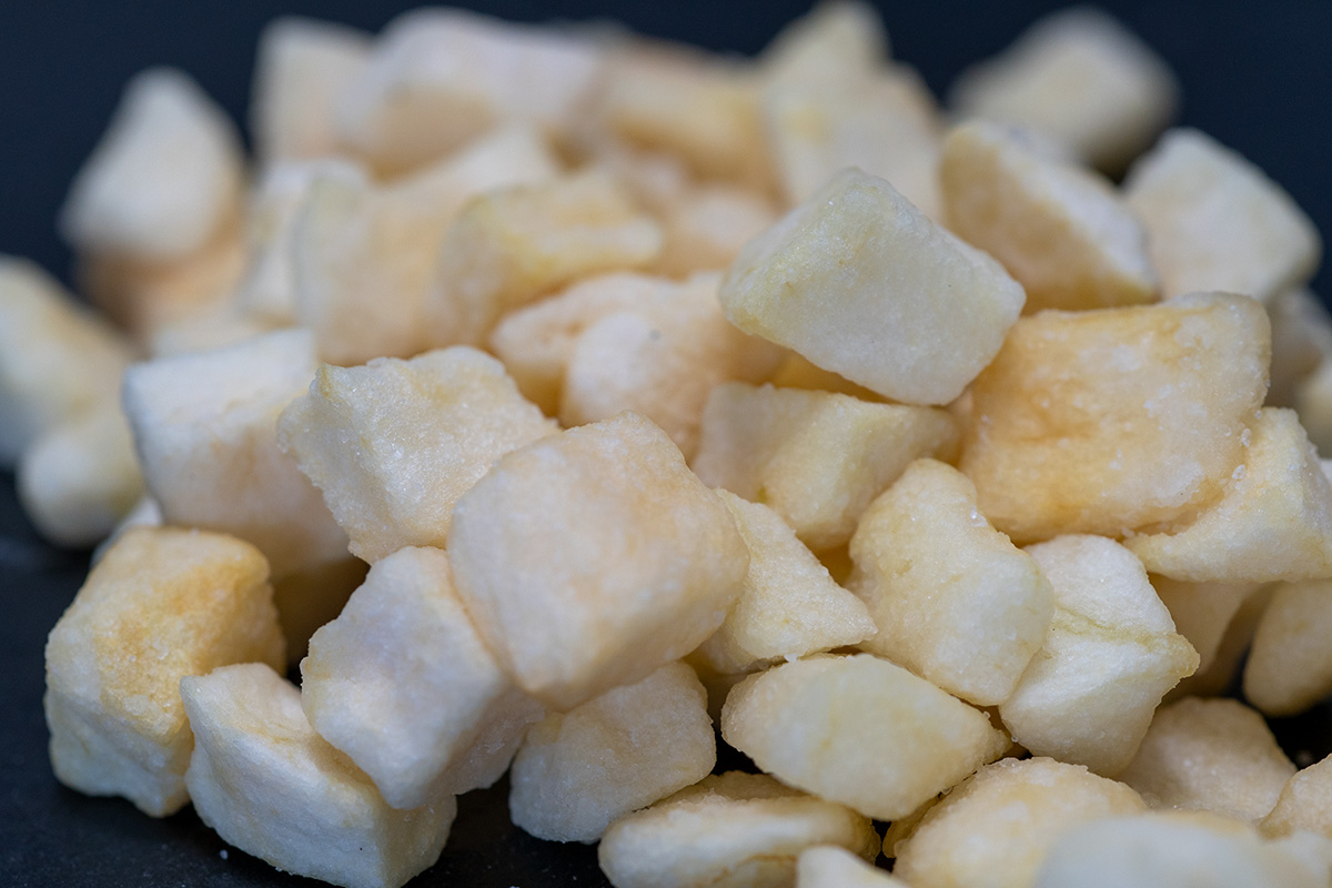 フルーツをダイスカットして、砂糖、パーム油と混合することでパリッとした食感と高い防湿性を持たせたフリーズドライフルーツ製品です。