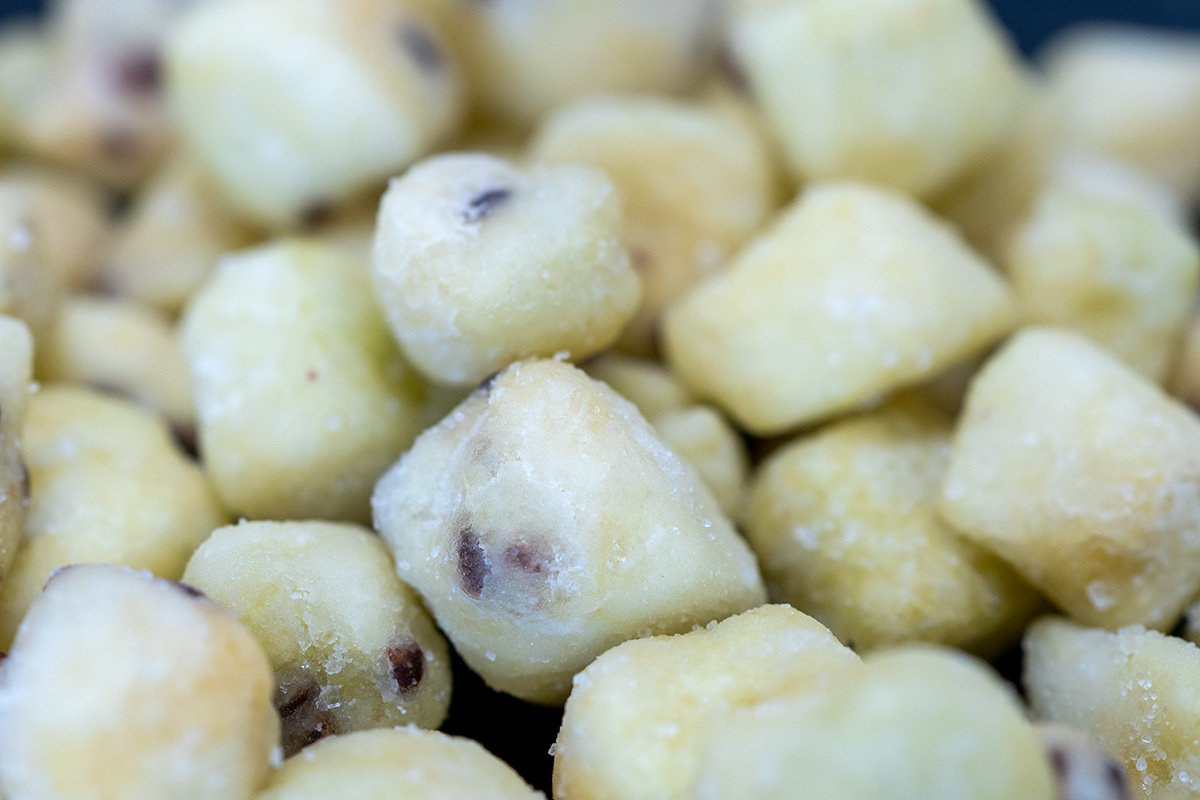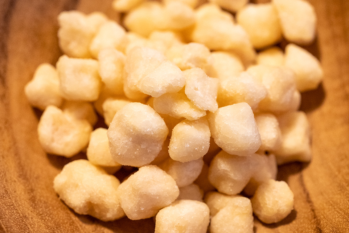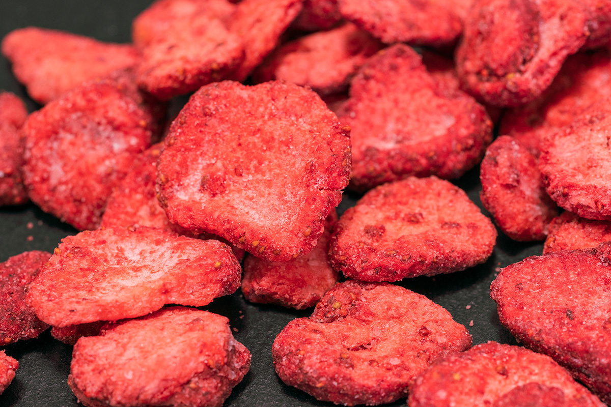 通常のフリーズドライしたフルーツは吸湿しやすかったり、大変脆く砕けやすかったりしますが、この加工を施すことでサクッと・パリッとした硬めの食感になり、砕けたり微粉が発生したりするリスクを低減すると共に、吸湿して軟化したりすることもありません。グラノーラやミックスナッツなどへのブレンド、チョコレートやケーキなどのトッピングなどに最適です。