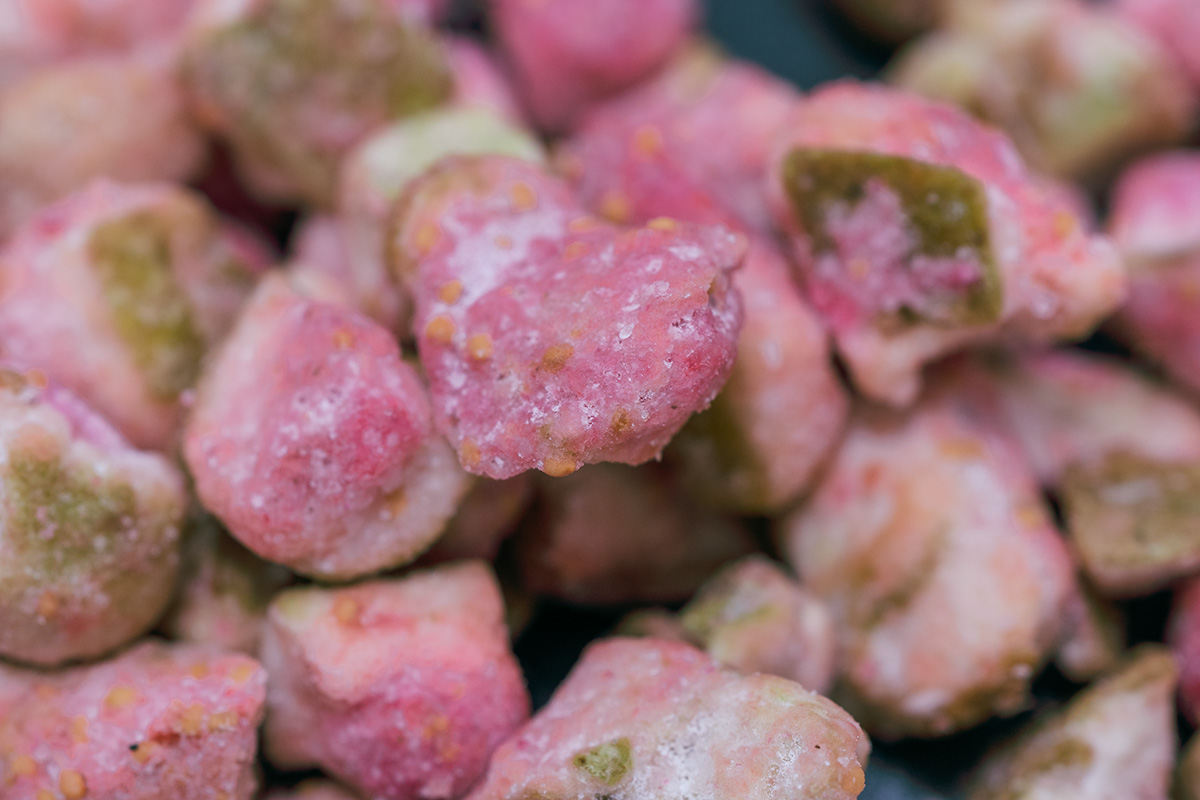 吸湿しやすいFDフルーツに防湿加工(砂糖、パーム油と混合して特殊乾燥)することでサクッと・パリッとした硬めの食感になり、吸湿して軟化しにくくなります。グラノーラやミックスナッツなどへのブレンド、チョコレートやケーキなどのトッピングなどに最適です。