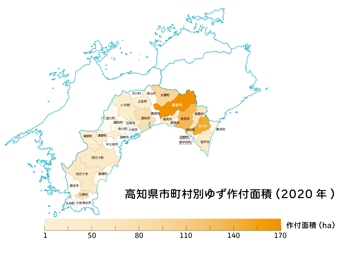 柚子(ユズ):高知県市町村別作付面積(2020年)